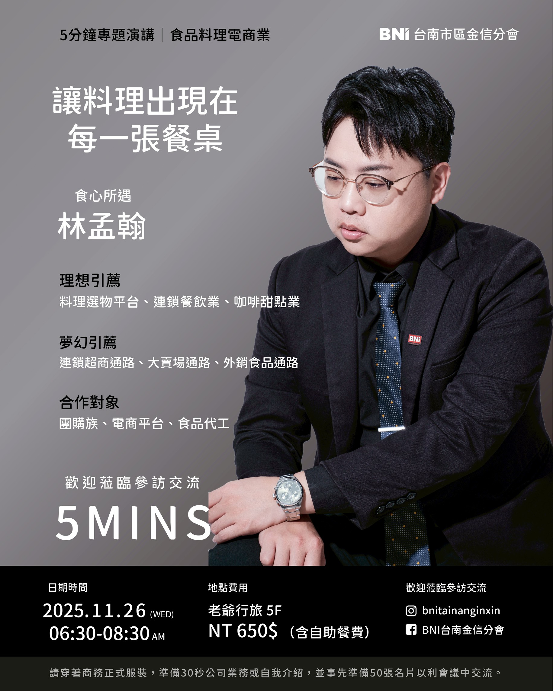 台南BNI金信分會由專業的商務人士組成, 透過商務培訓、與同行學習以及與全球數十萬名BNI會員建立人脈網絡與開展事業的機會。